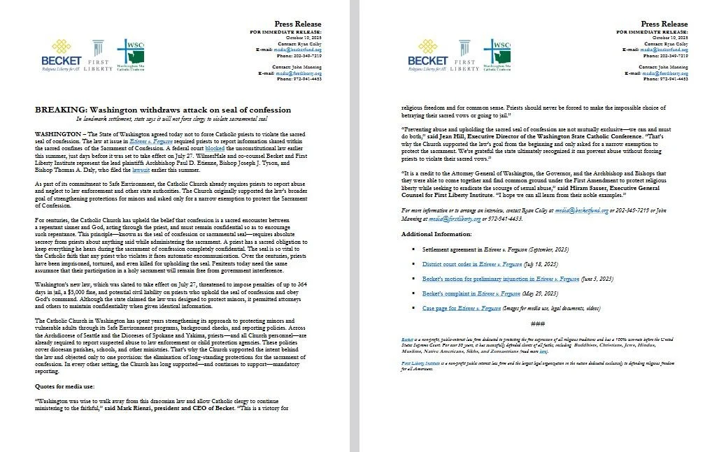 Read Archbishop Etienne's statement upon the Governor's signing of SB 5375 making clergy in WA state mandatory reporters of abuse with no exemption for the privileged communication between priest and penitent during the Sacrament of Reconciliation. Also, listen to Archbishop's interview on Sacred Heart Radio.