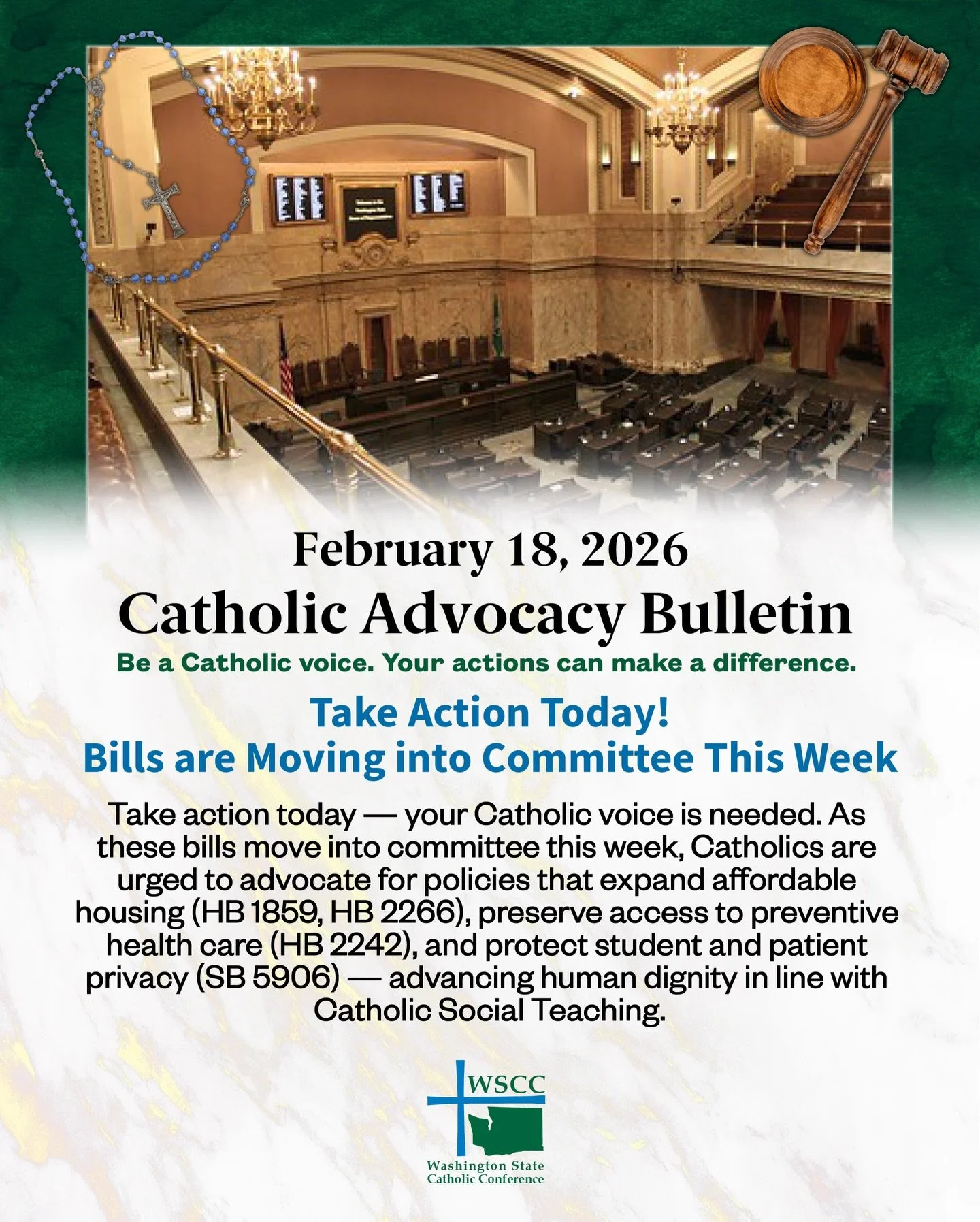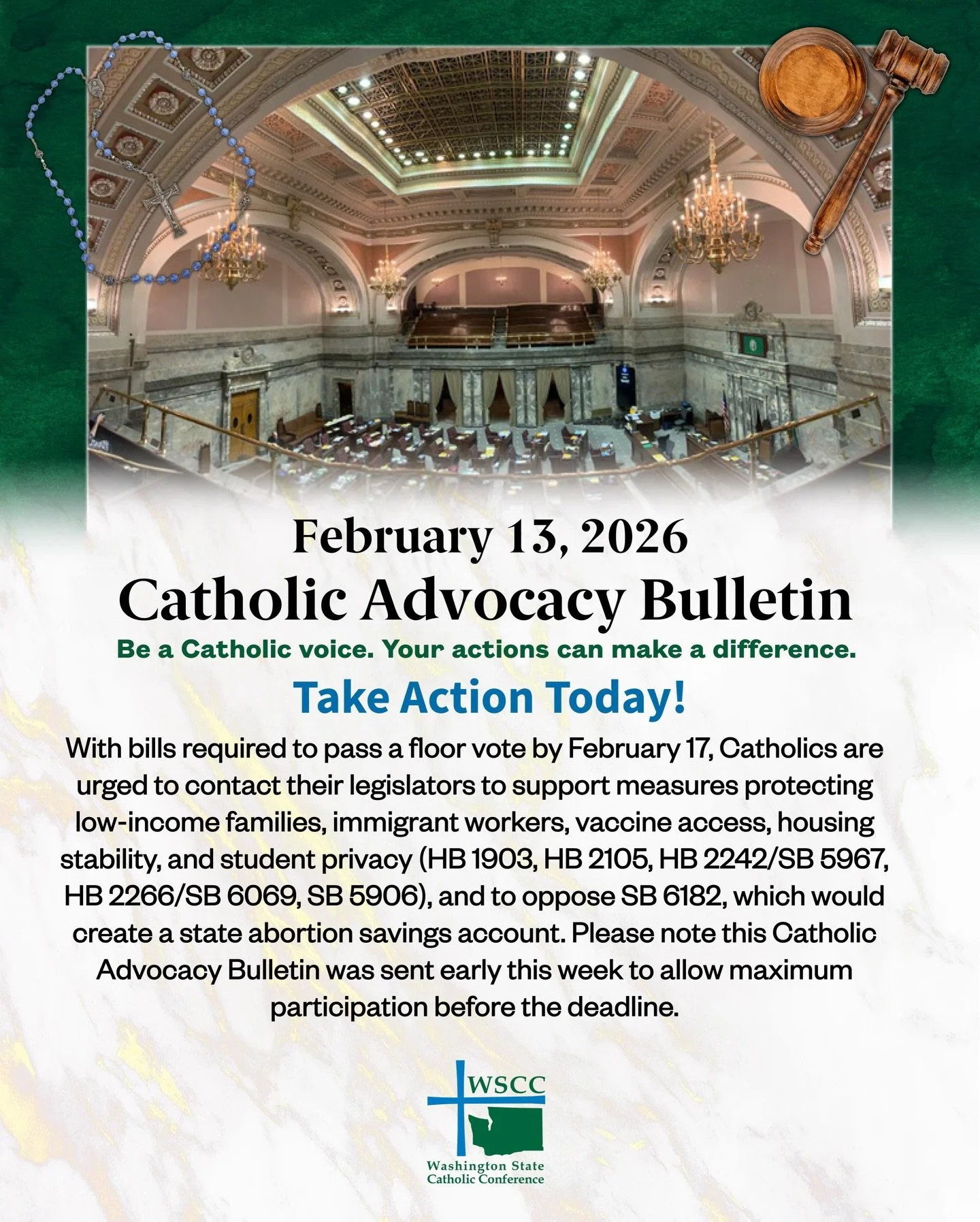 Read the Catholic Advocacy Bulletin to stay up-to-date on policy issues of importance to Catholics across WA State.
